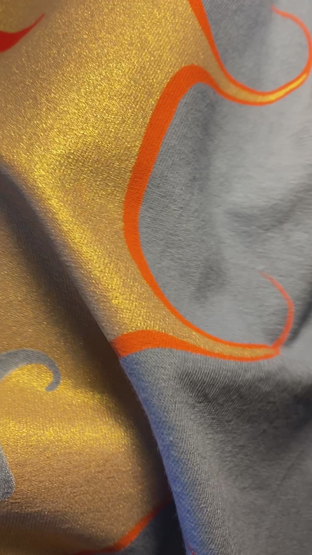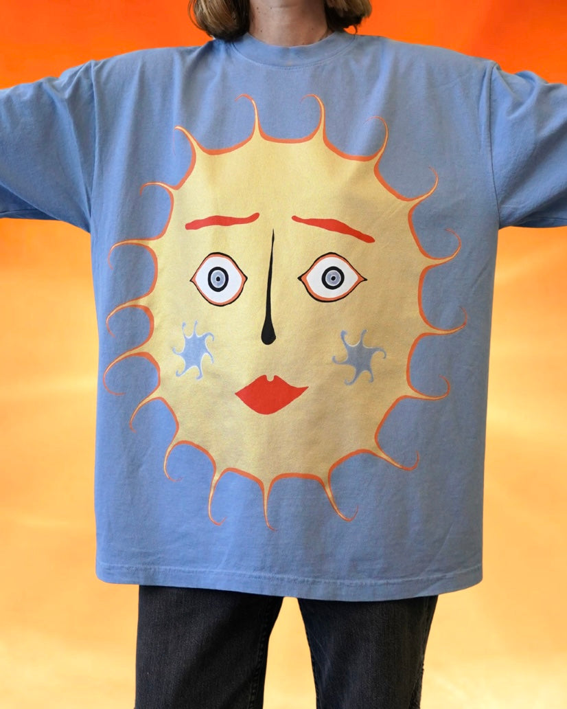 In a shimmery metallic gold, this enormous sun face radiates calm and warmth. Unisex sizing in a heavyweight light blue cotton.