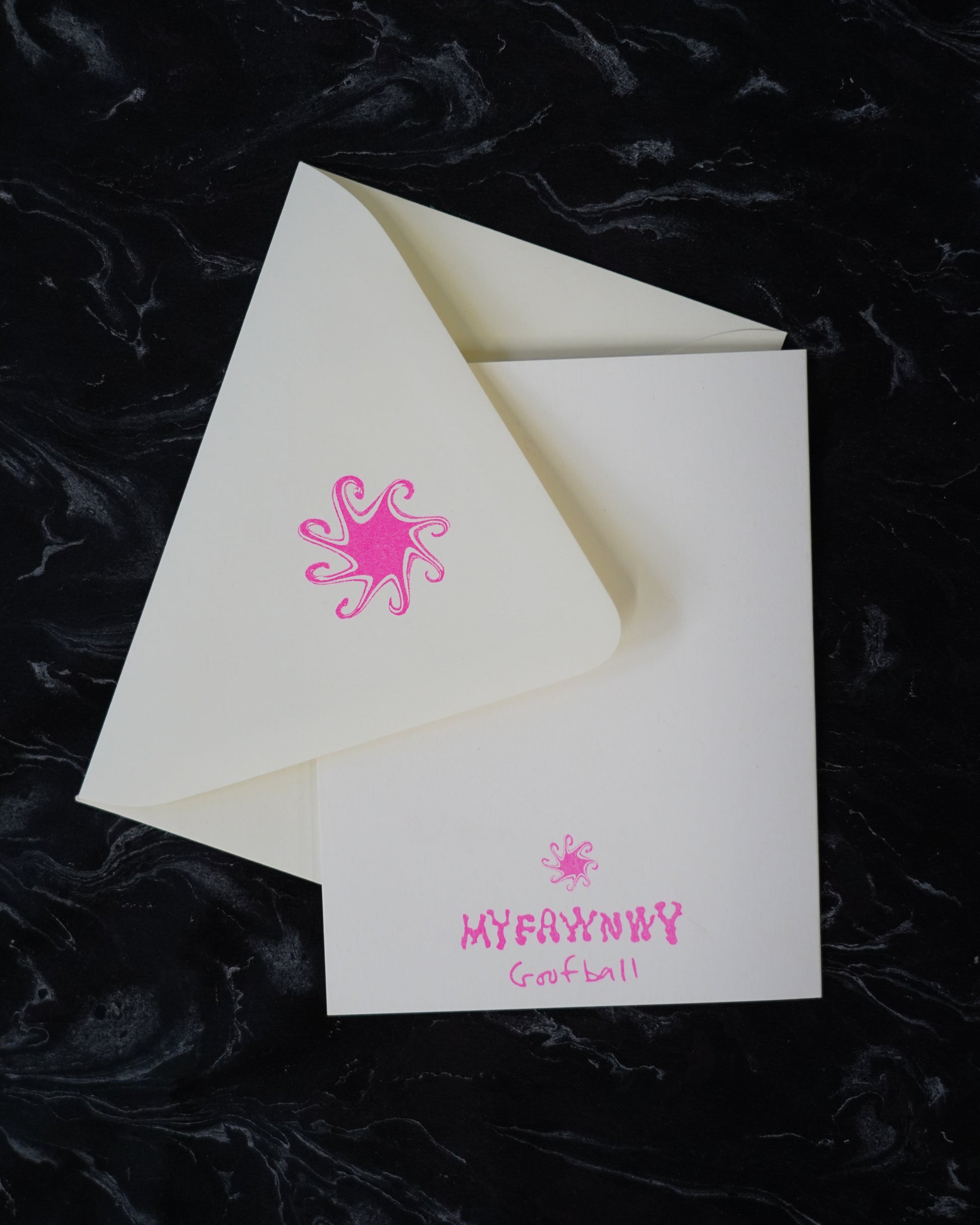 A set of 3 Goofball greeting cards, risograph printed in NYC. Cards measure 5 1/2" X 4 1/4". Comes with cream colored envelopes that have a sweet little risograph detail on the flap.