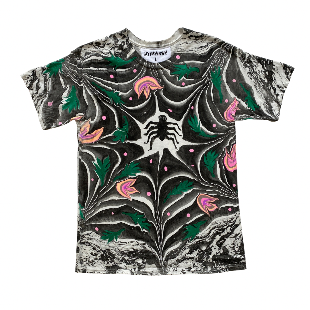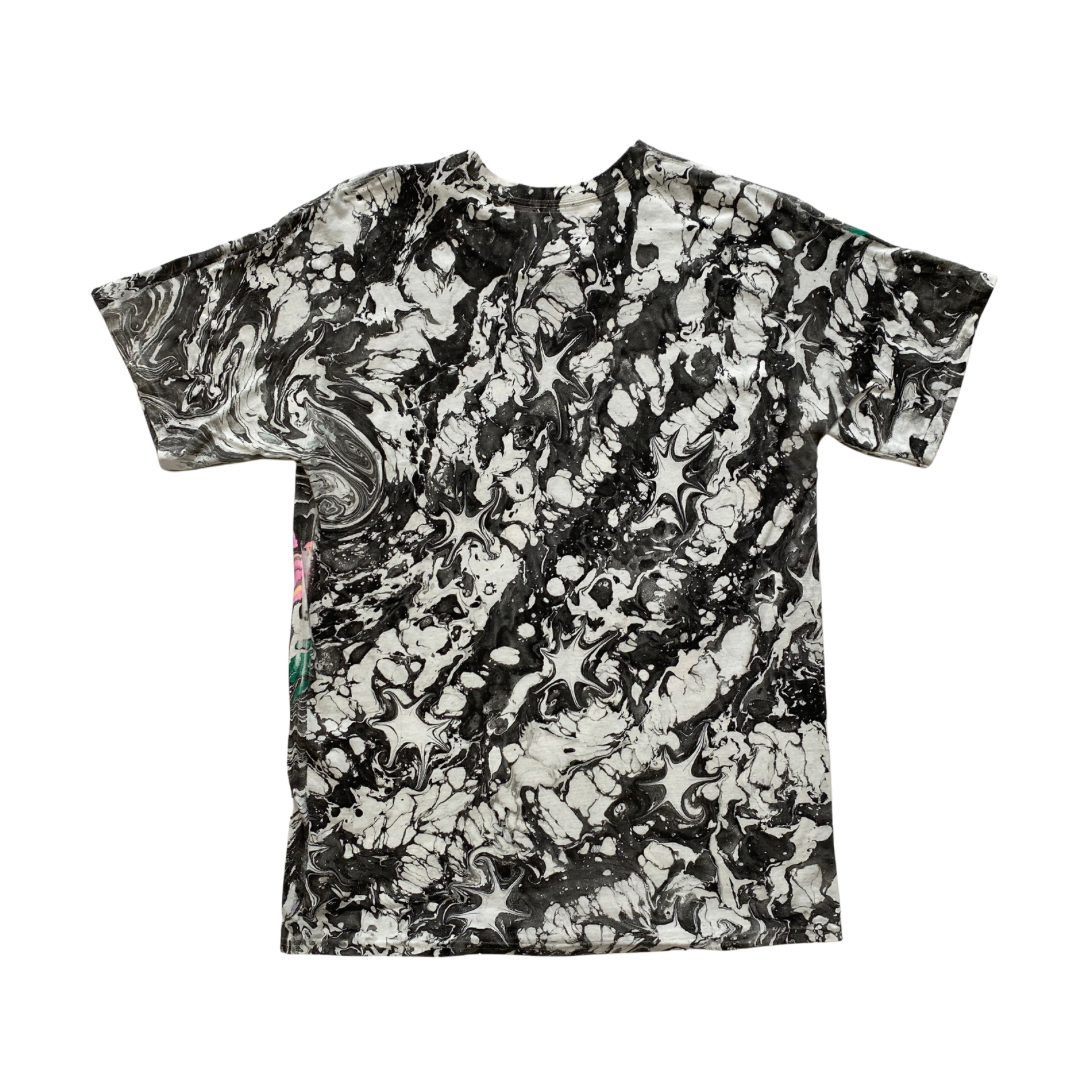 One-of-a-kind hand marbled artwork on unisex cotton T.